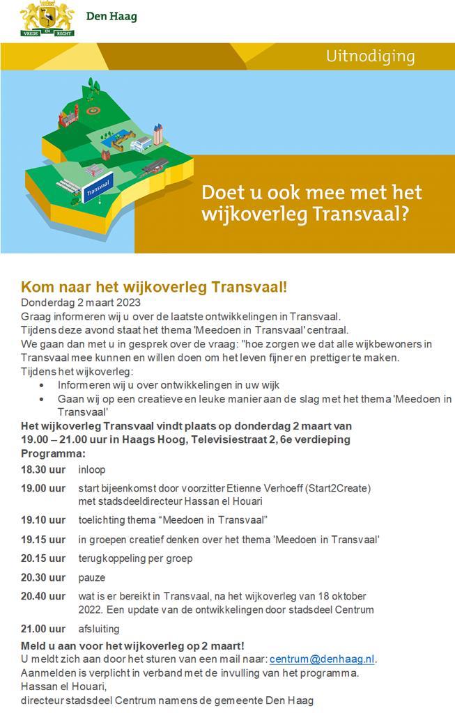 We gaan graag met u in gesprek over het thema “Meedoen in Transvaal”.Hoe zorgen we ervoor dat alle bewoners in Transvaal mee kunnen én willen doen om het leven in de wijk fijner en prettiger te maken!